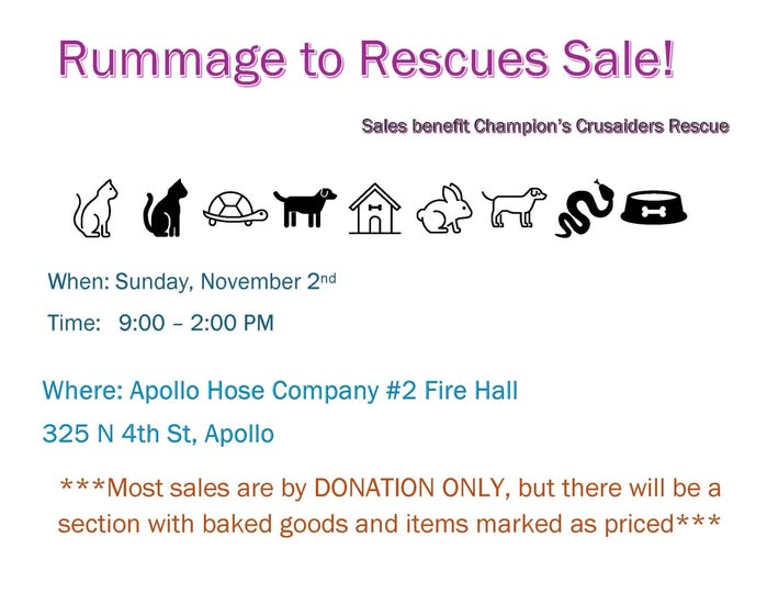 Fundraising Events Sunday, November 2, 2025 – Rummage to Rescues Sale – 9 am to 2 pm – Apollo Hose company # 2 Fire Hall – 235 North 4th Street